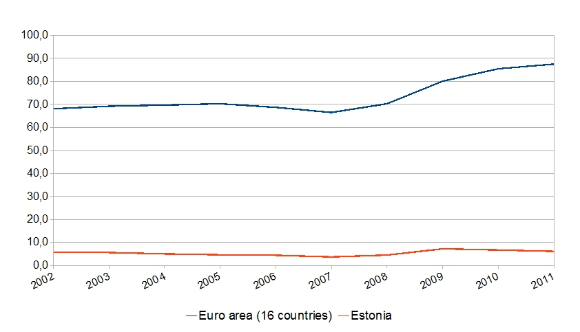 Consolidated Government debt, percentage of GDP (Source: Eurostat)