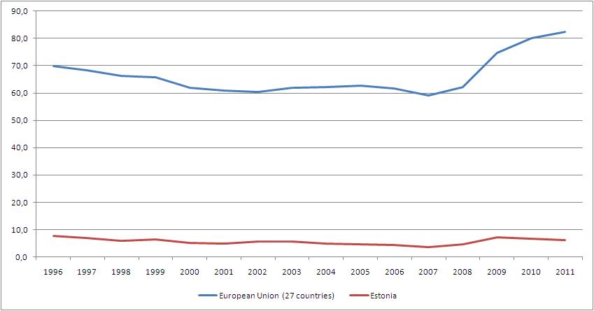 Government consolidated gross debt, percentage of GDP (Source: Eurostat)